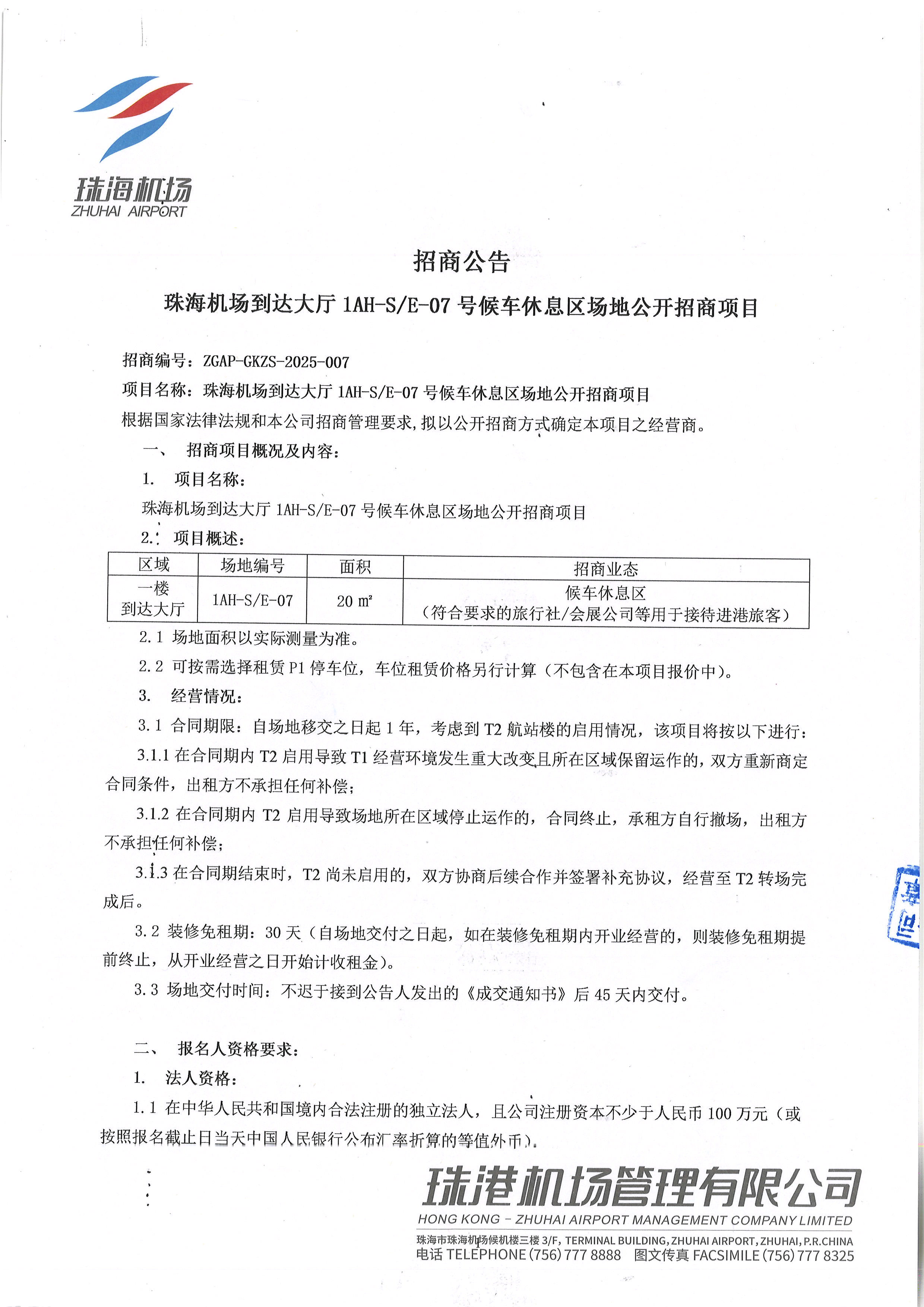 珠海機場到達大廳1AH-S/E-07號候車休息區場地公開招商項目