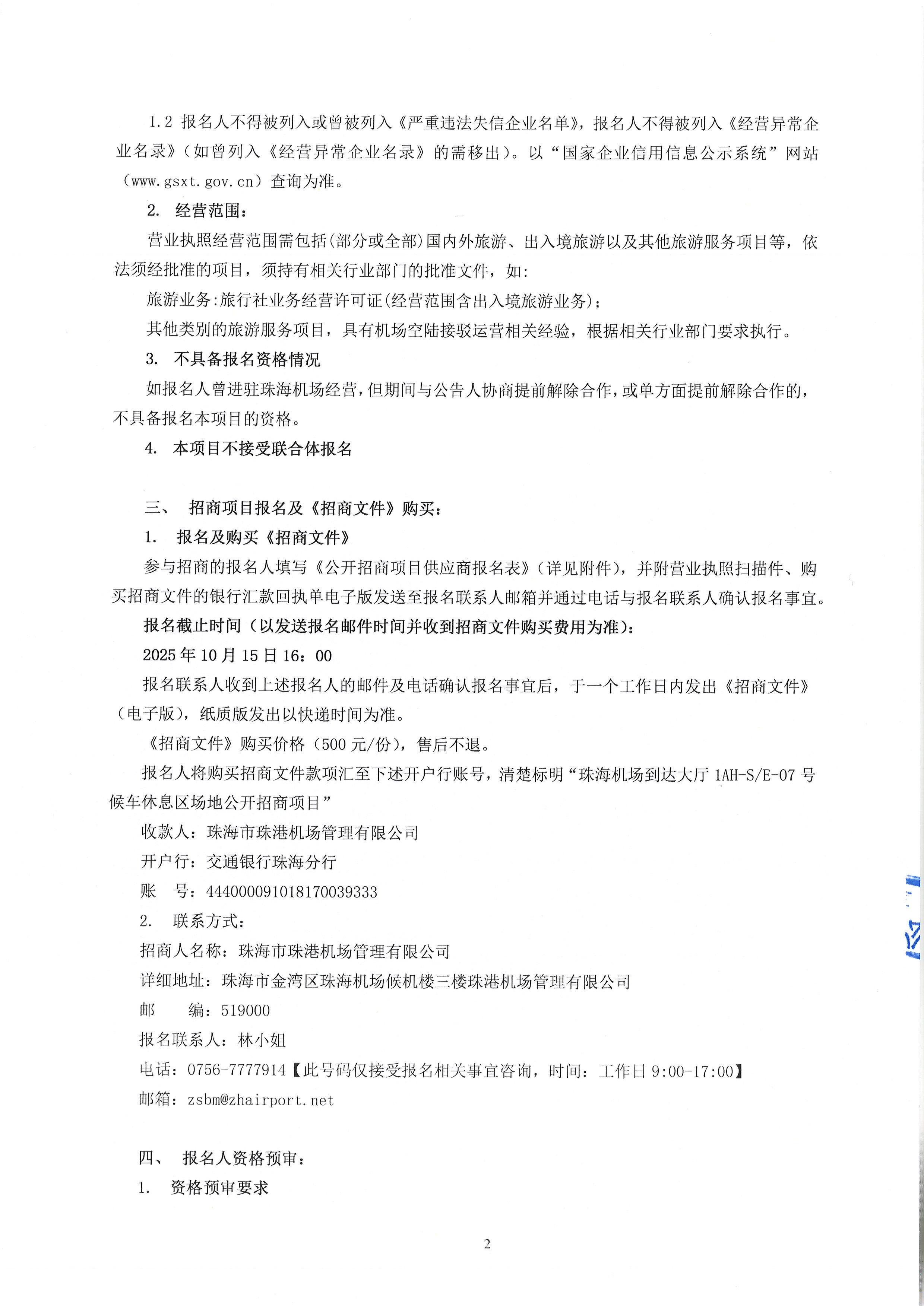 珠海機場到達大廳候車休息區場地公開招商項目-報名附件