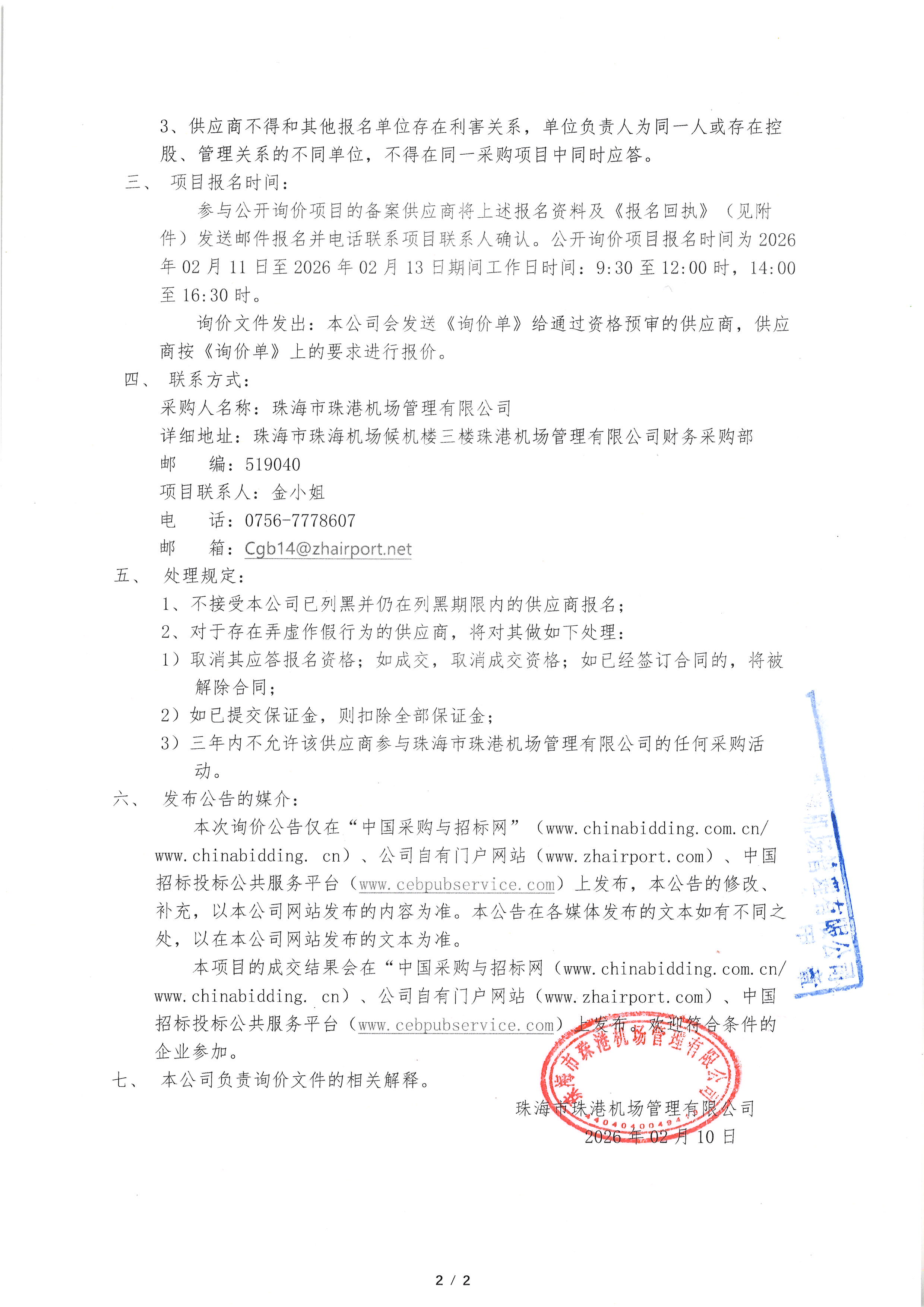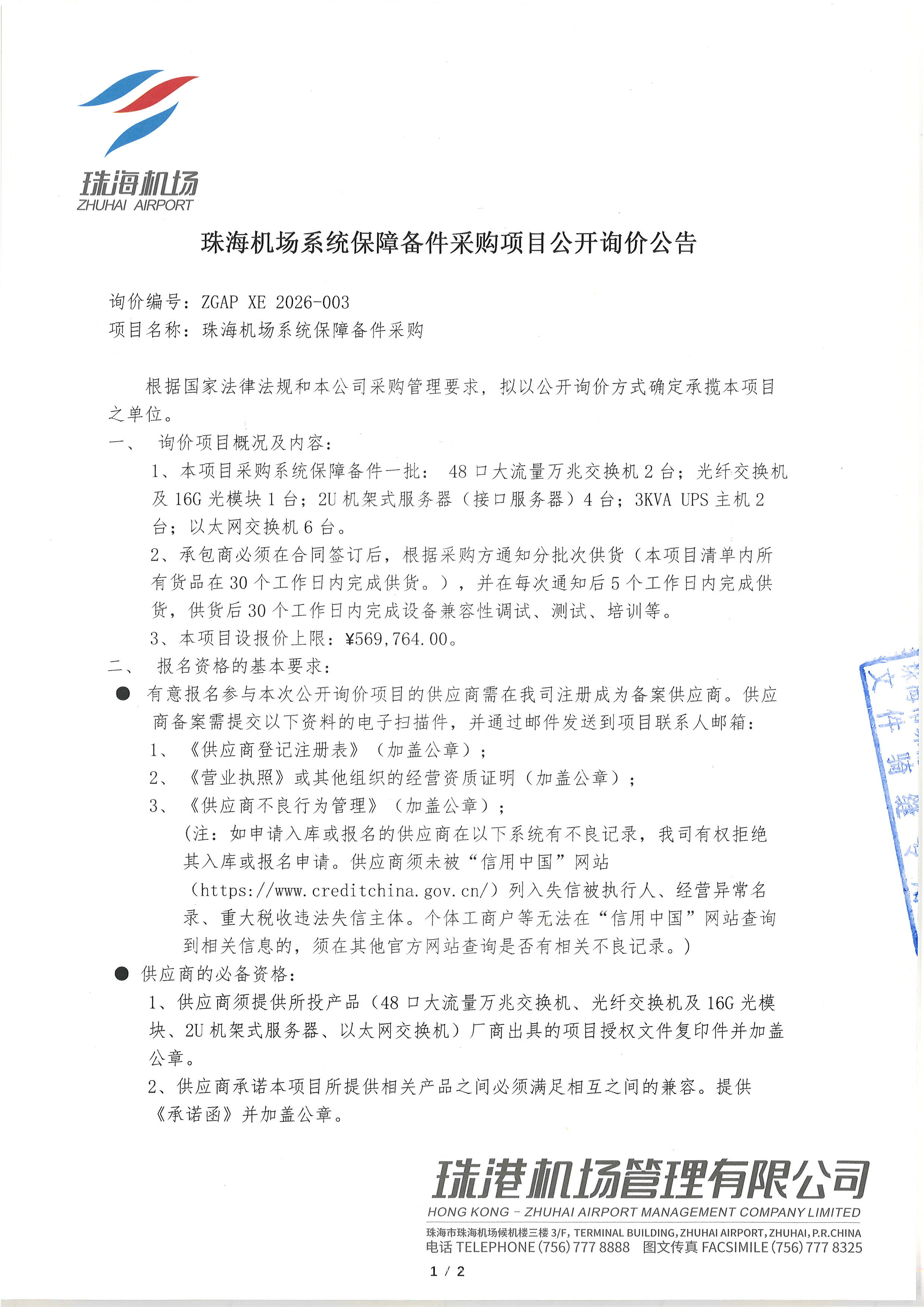 珠海機場系統保障備件采購項目公開詢價公告