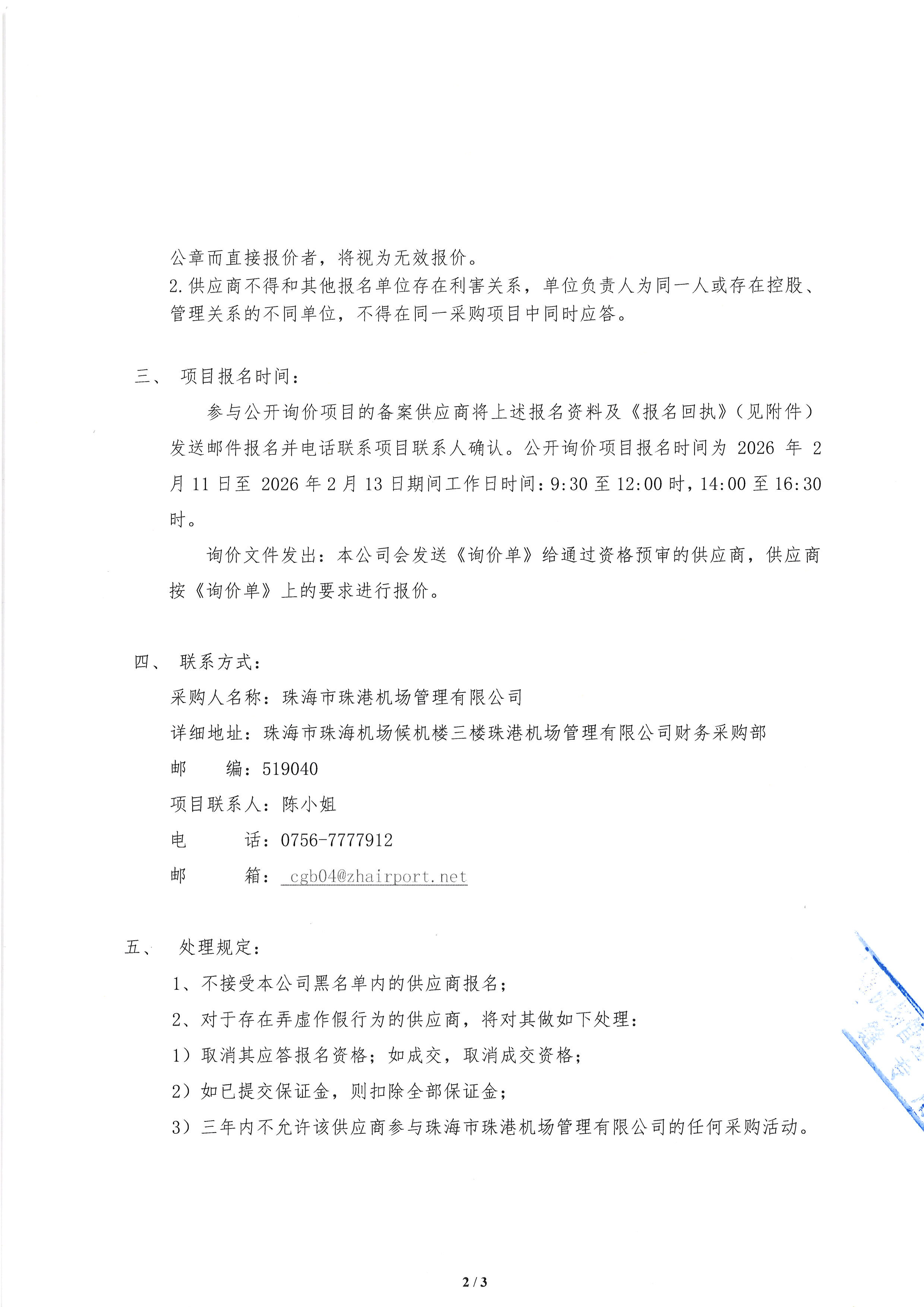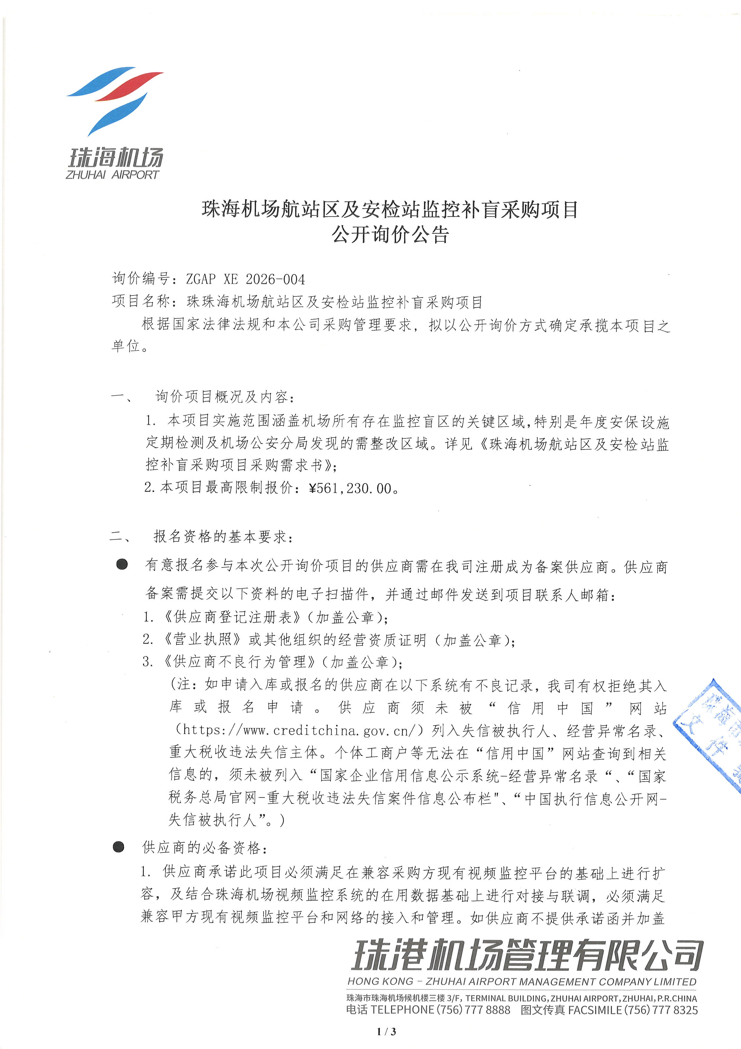 珠海機場航站區及安檢站監控補盲采購項目 公開詢價公告
