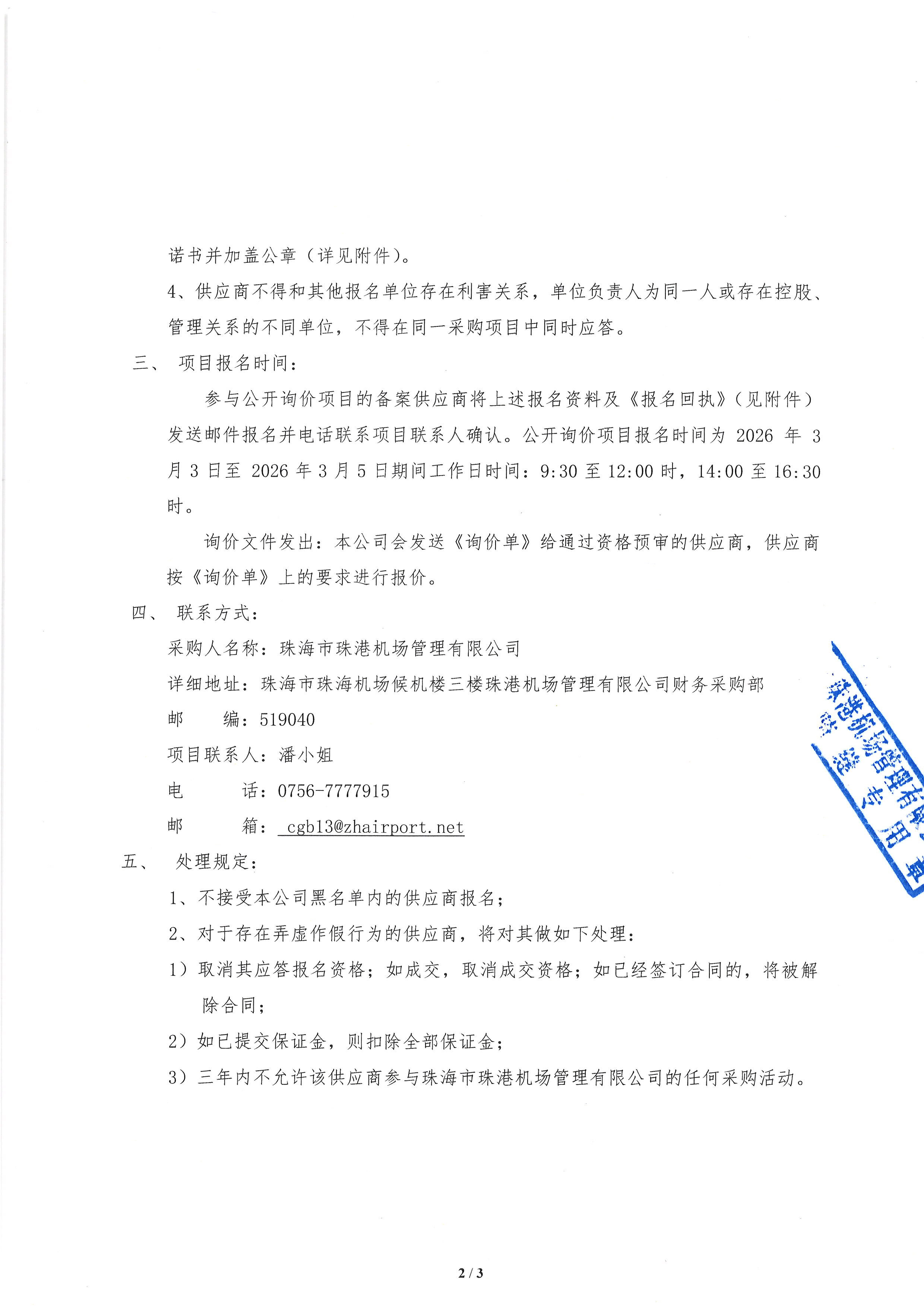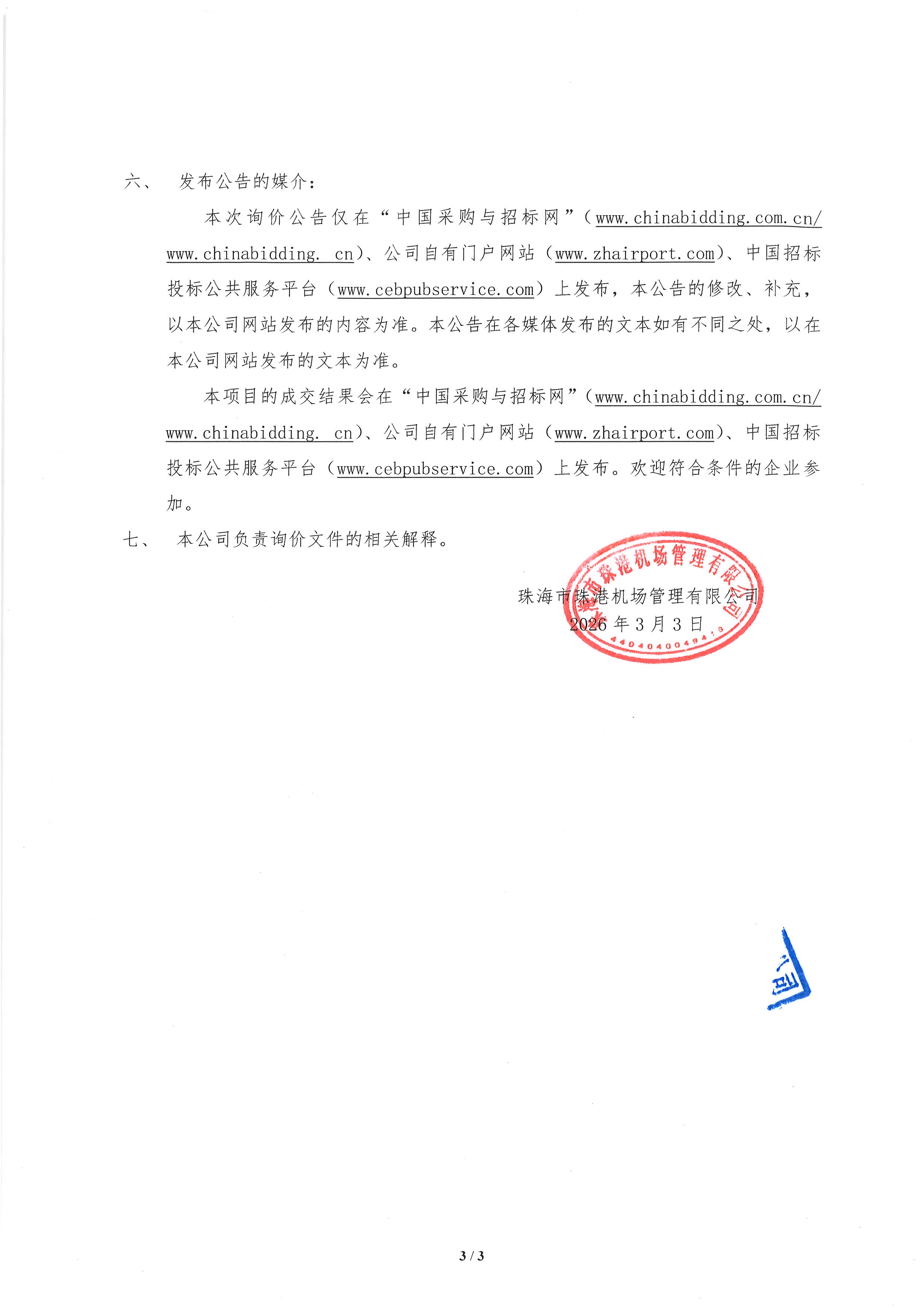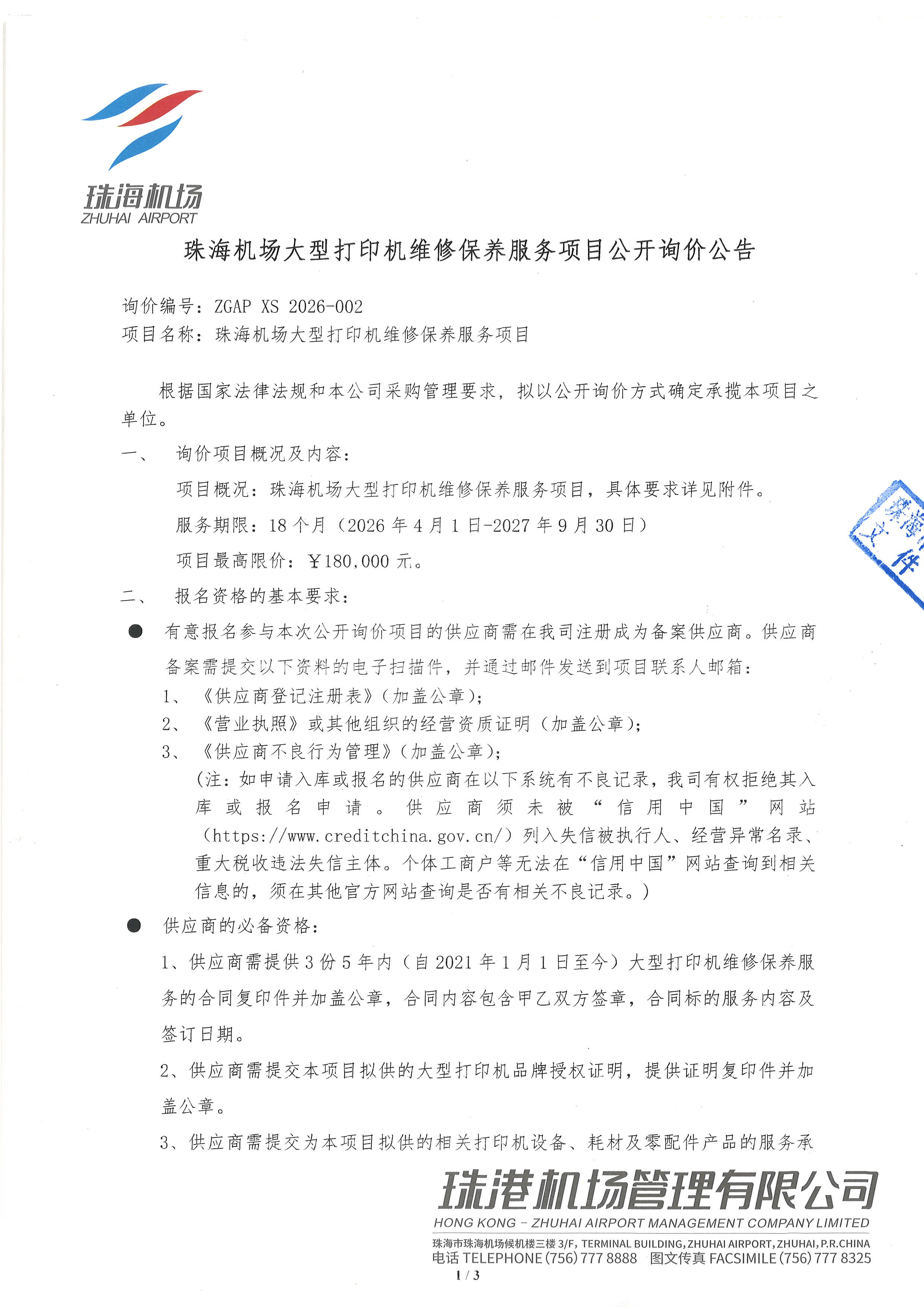 珠海機場大型打印機維修保養服務項目公開詢價公告