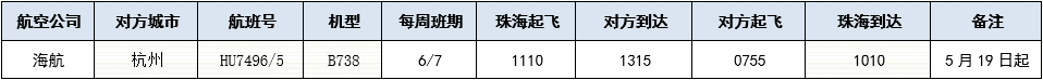 5月19日起,海南航空新增杭州=珠海HU7495/6航班,每周2班