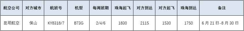 因騰沖進入雨季,6月21日-8月30日期間昆明航空執行的珠海=騰沖KY8336/5航班優化為珠海=保山KY8318/7,每周2/4/6執行。