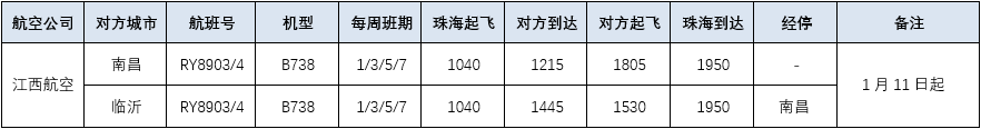江西航空現執行的珠海=南昌RY8914/3航班(每天一班)自1月11日起調整為珠海=南昌=臨沂RY8903/4,每周四班(逢周1/3/5/7)執行。