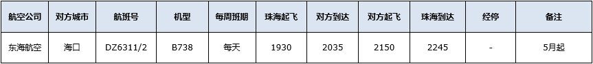5月起,東海航空新增DZ6311/2?珠海=海口航班?每天一班