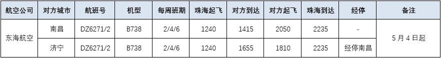 5月4日起,東海航空新開(kāi)通珠海=南昌=濟(jì)寧?DZ6271/2航班,每周三班(逢周2/4/6)執(zhí)行