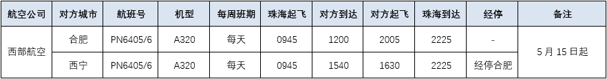 5月15日起,西部航空現(xiàn)執(zhí)行的珠海=合肥=西寧 PN6405/6航班,由每周四班(逢周1/3/5/7)加密至每天一班