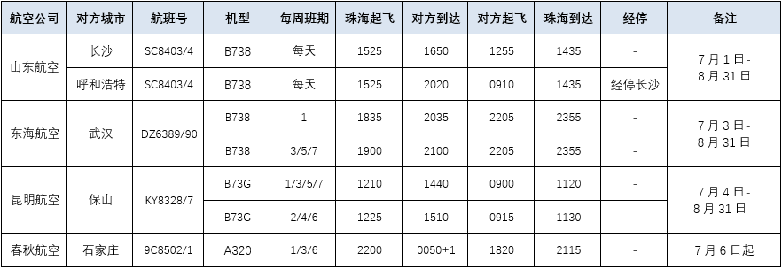 1. 7月1日-8月31日,山東航空新增加珠海=長沙=呼和浩特 SC8403/4航班,每天一班;