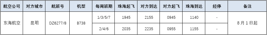 因東海航空運力調整,8月1日起,現執行的珠海=南陽 DZ6319/20航班(1/3/5/7)取消;現執行的珠海=昆明 DZ6277/8航班由每周3班(2/4/6)加密至每天一班