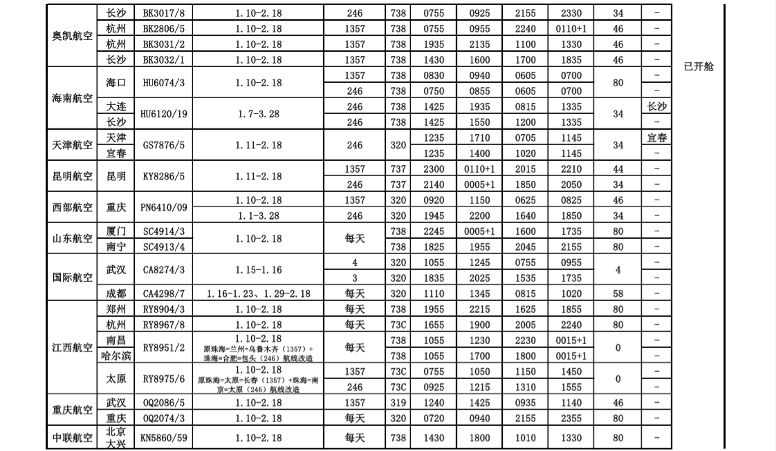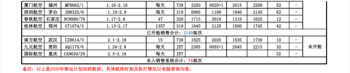2020年民航春運時間自1月10日至2月18日,共計40天。春運期間,珠海至北京大興、博鰲、南充、茅臺、宜春、南昌、杭州、貴陽、鄭州、海口、長沙、成都、重慶等30個航點均有加班,共計2214架次(其中已開艙銷售共計2140架次)。 截至目前,尚有3個航班未進入電腦銷售系統(共計74架次)。