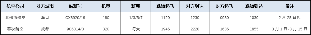 2月28日起,廣西北部灣航空新增加珠海=海口 GX8920/19航班,每周4班(1/3/5/7); 3月1日-3月15日,春秋航空新增加珠海=成都 9C6314/3航班,每天一班