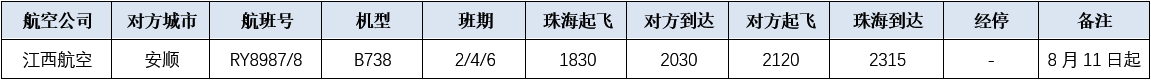 8月11日起,江西航空新開(kāi)通珠海=安順 RY8987/8航班,每周三班(2/4/6)