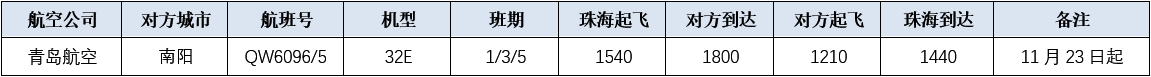 11月23日起,青島航空恢復珠海=南陽QW6096/5航班,每周3班(1/3/5)