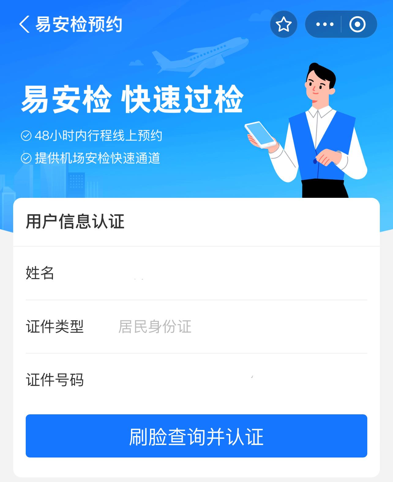 第二步:點擊“易安檢”模塊,進行實名認證,完成安檢知識在線測試,預約“易安檢”服務。