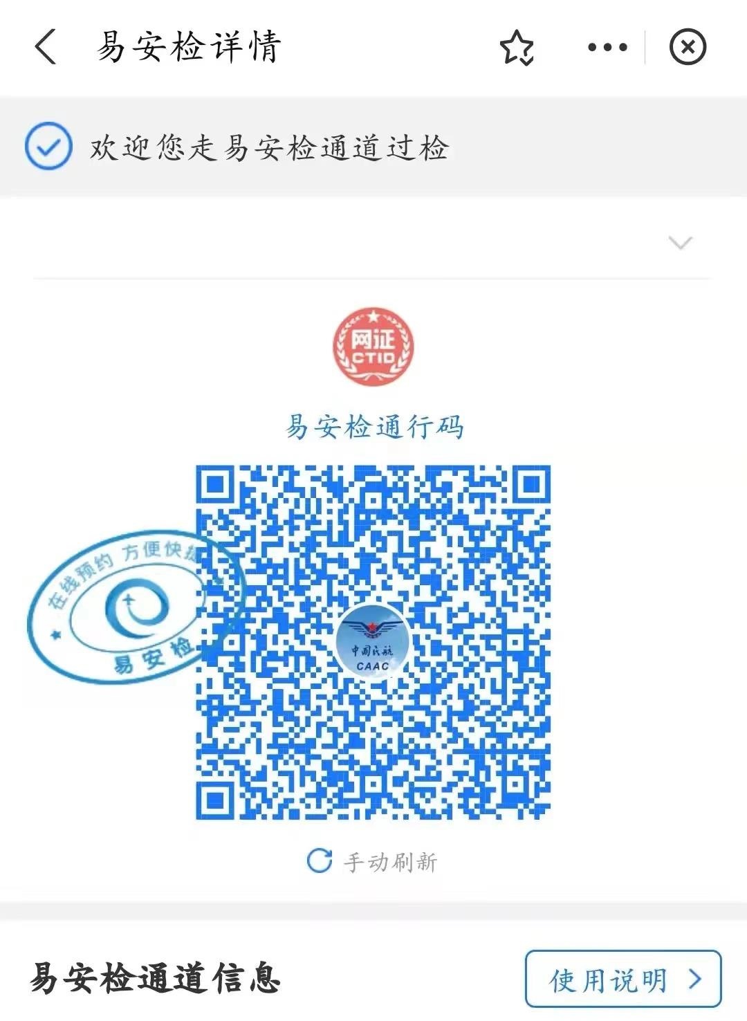 第三步:經系統審核成功的旅客,將會收到“易安檢”通道引導信息及“易安檢”通行碼。