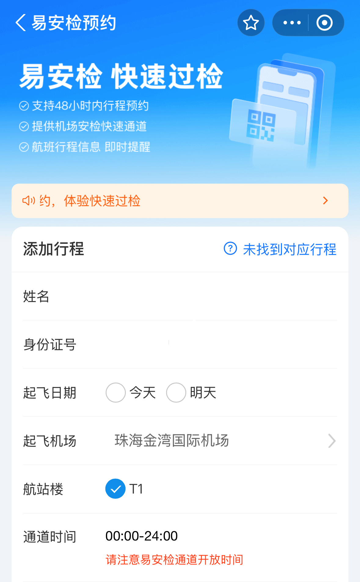 目前,珠海機場共設有2條“易安檢”專用通道,分別位于候機樓二樓安檢區A1和B1通道。在安檢現場設立了醒目的“易安檢”微信小程序指示牌和地面指引標志。在航班起飛前48小時內隨時預約服務,也可在機場當場注冊、即時預約、立等使用“易安檢”服務。