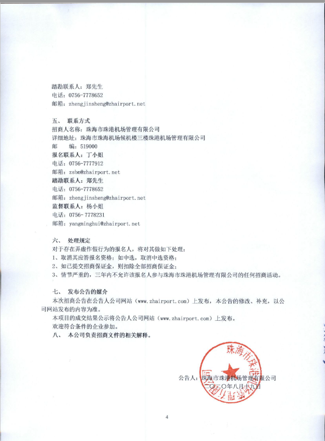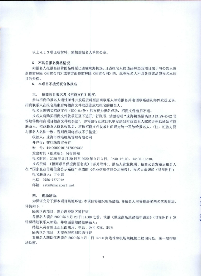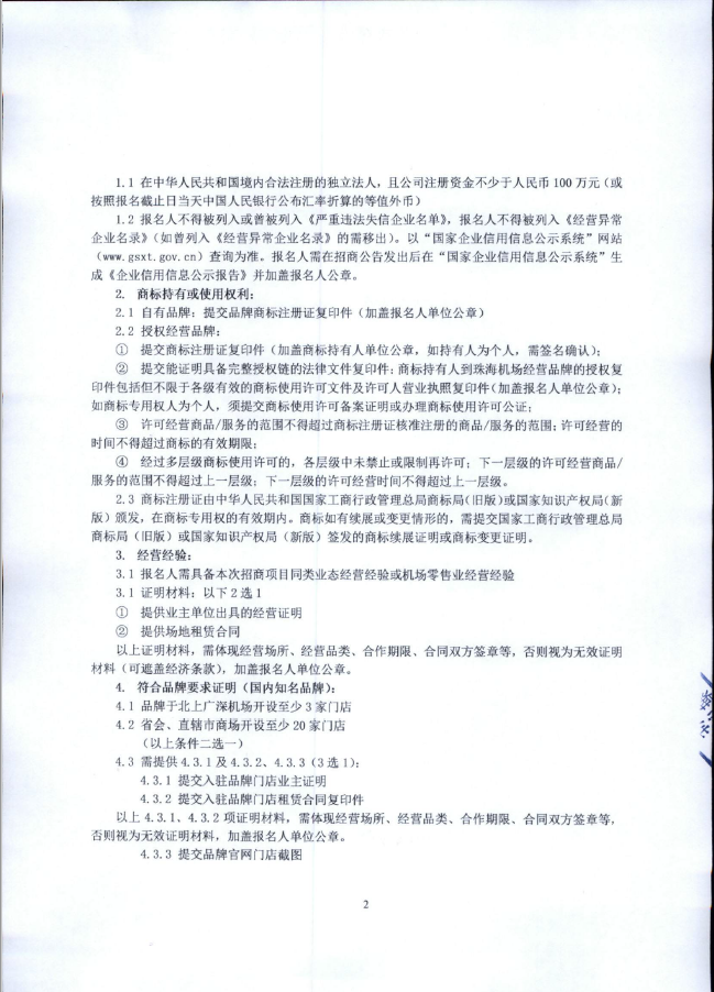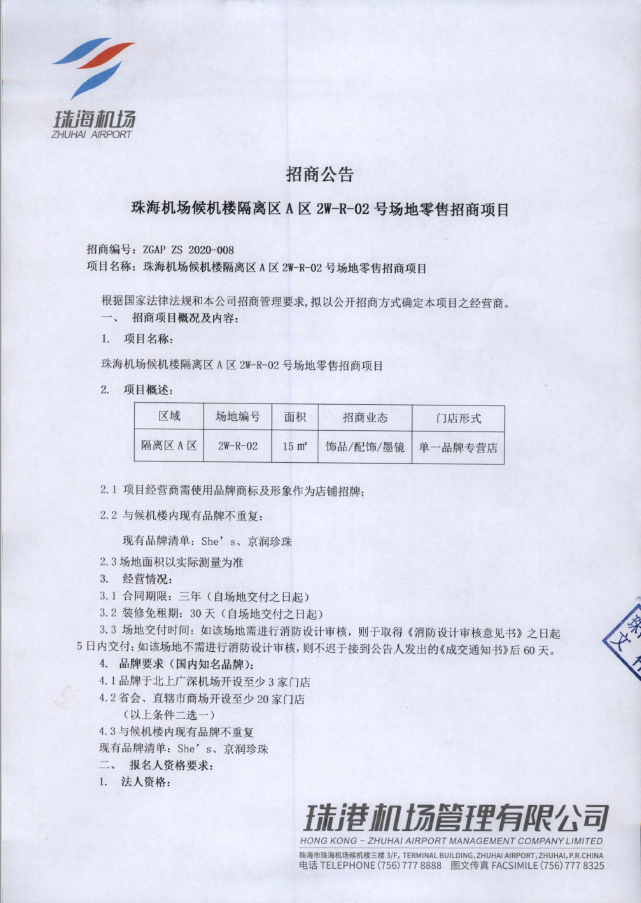 珠海機場候機樓隔離區A區2W-R-02號場地零售招商項目招商公告(第二次)