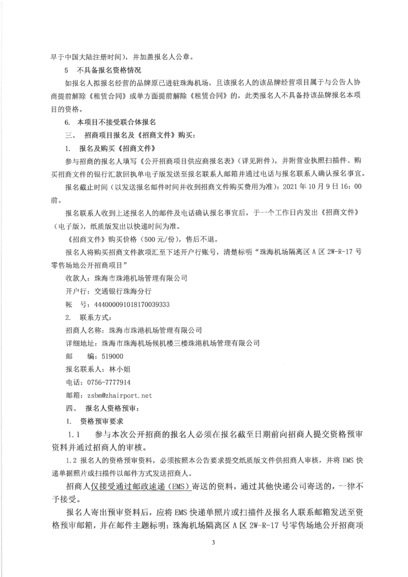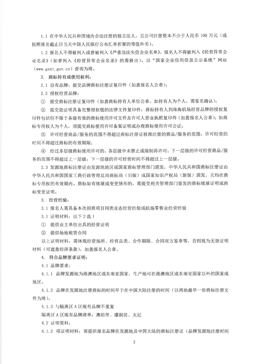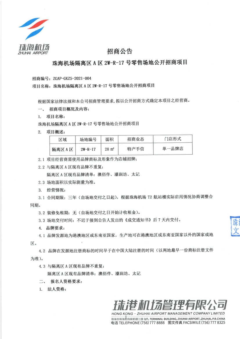 珠海機場隔離區(qū)A區(qū)2W-R-17號零售場地公開招商項目