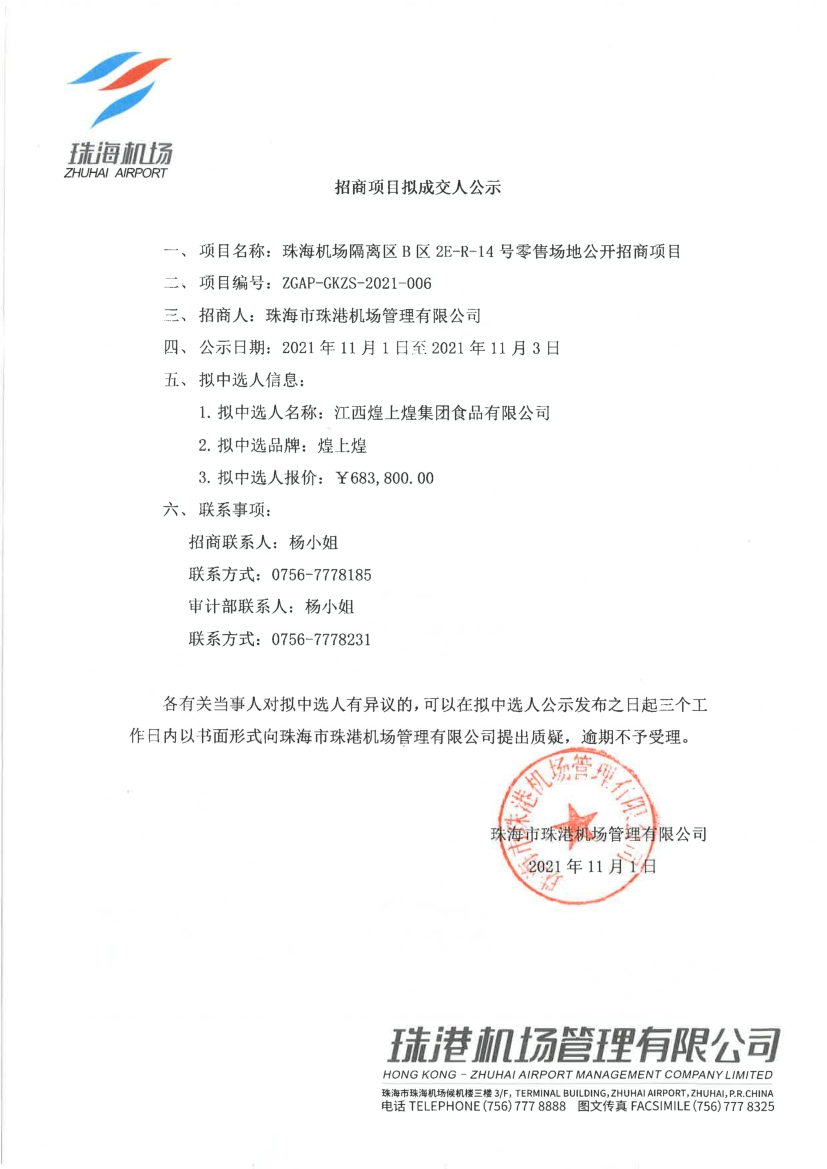 珠海機場隔離區B區2E-R-14號零售場地公開招商項目擬中選人公示