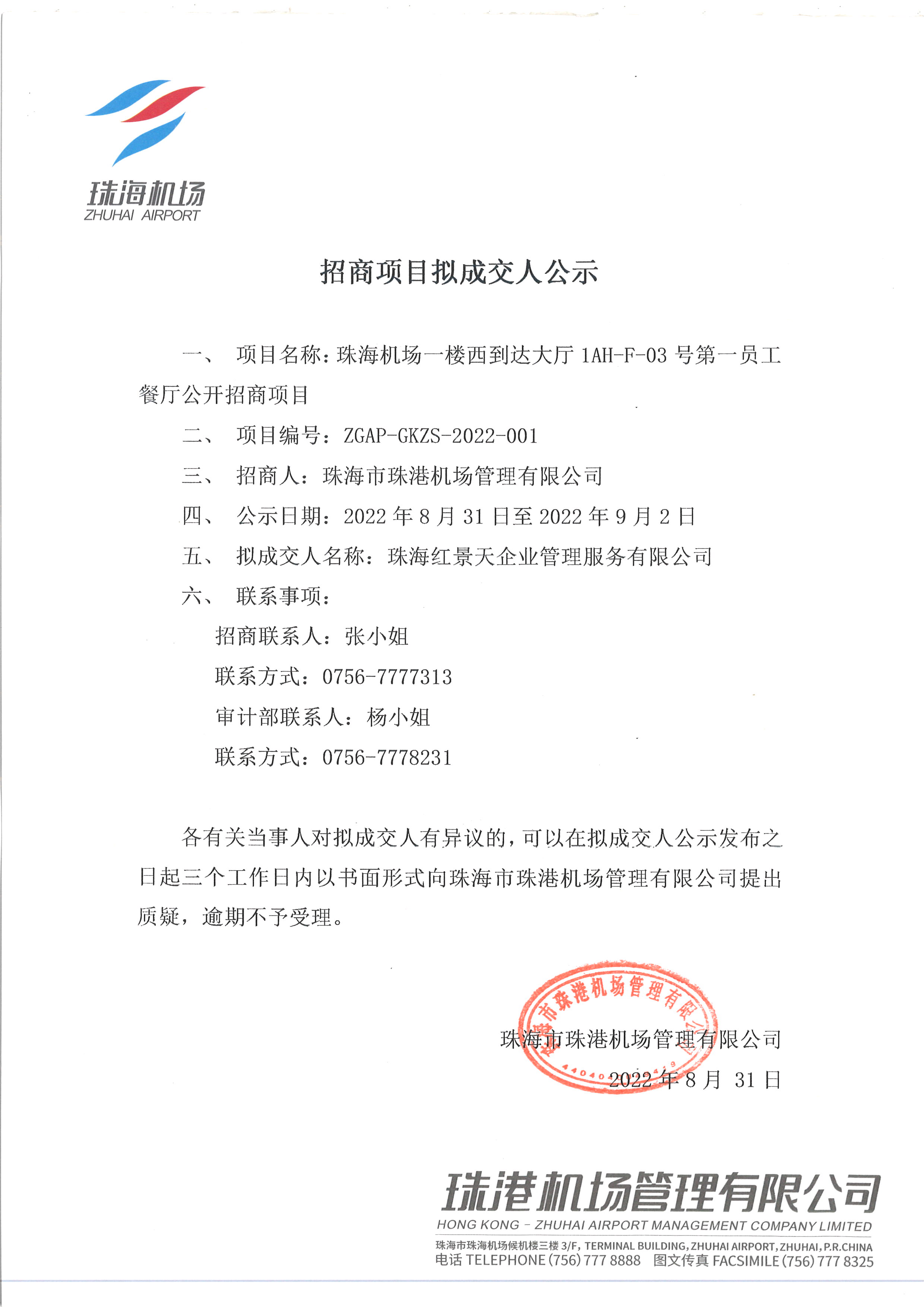 珠海機場一樓西到達大廳1AH-F-03號第一員工餐廳公開招商項目擬成交人公示