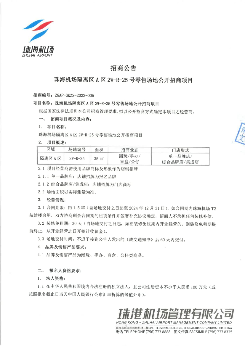 珠海機場隔離區A區2W-R-25號零售場地公開招商項目