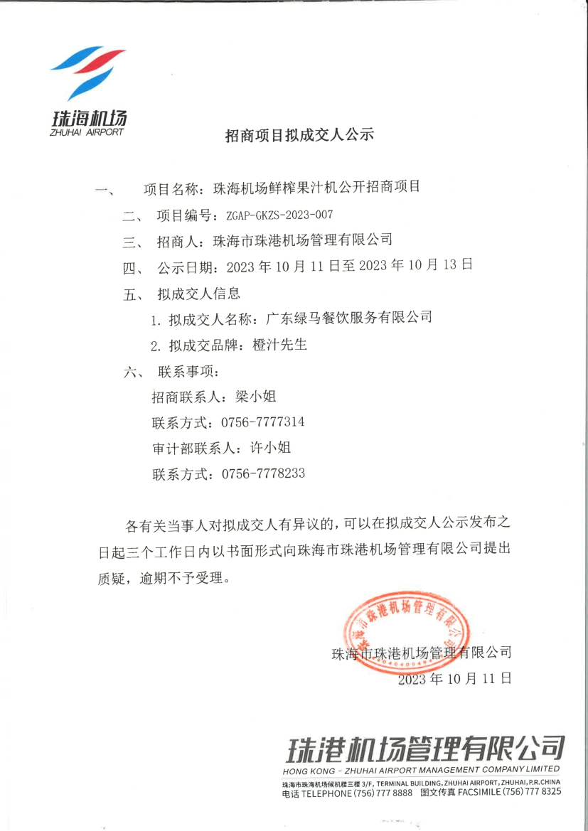 珠海機場鮮榨果汁機經營公開招商項目擬成交人公示