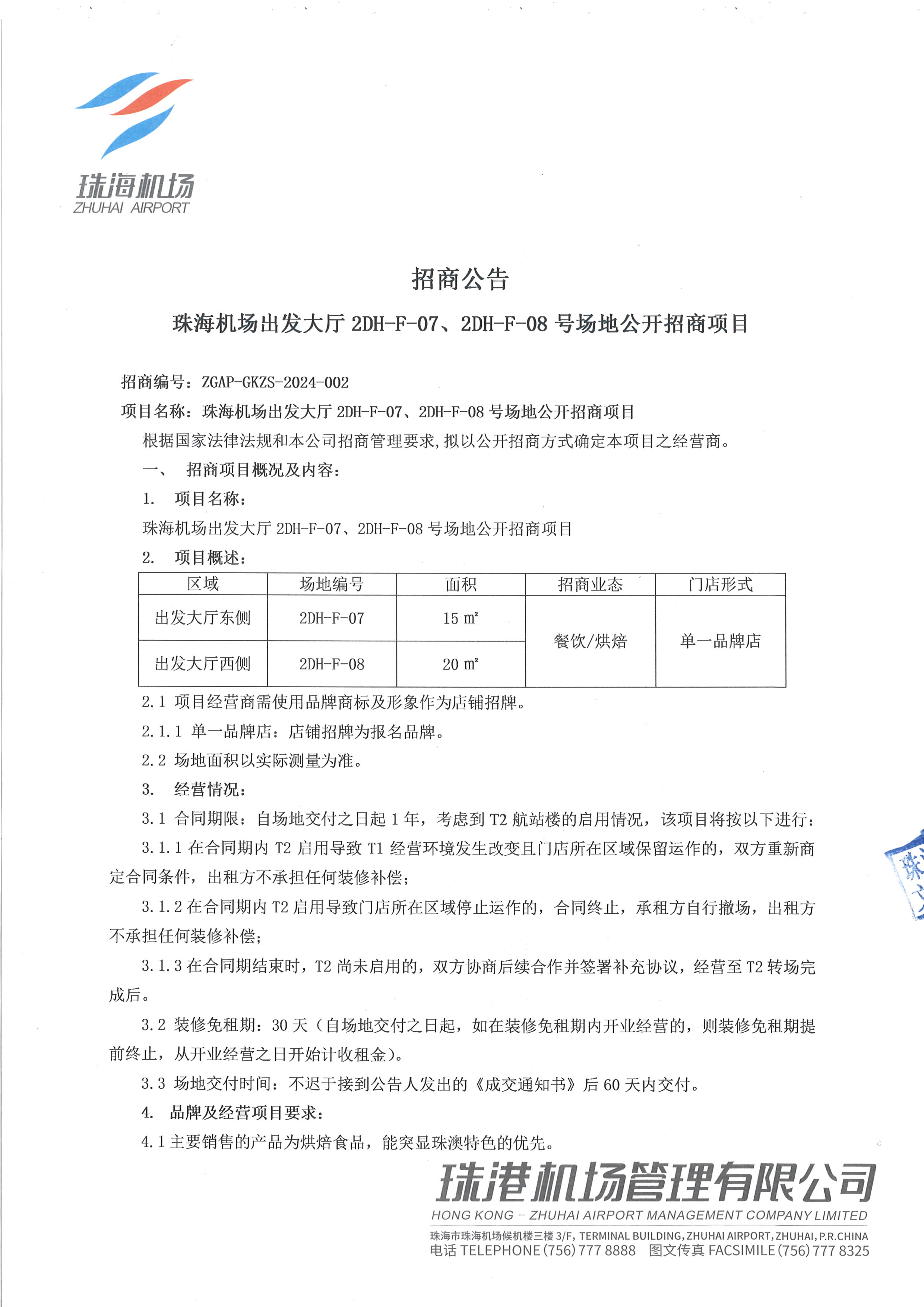珠海機場出發大廳2DH-F-07、2DH-F-08號場地公開招商項目