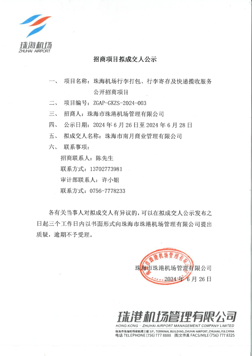 珠海機場行李打包、行李寄存及快遞攬收服務公開招商項目擬成交人公示