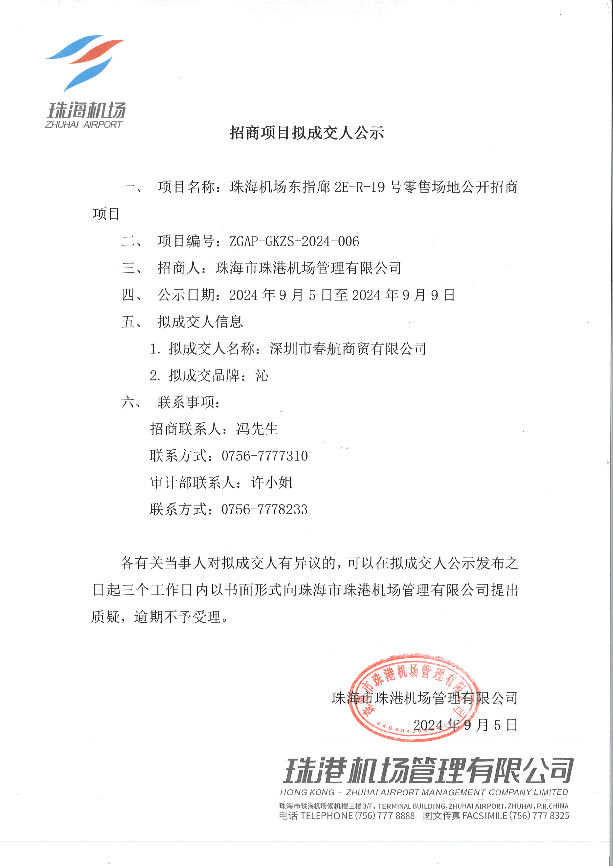 珠海機場東指廊2E-R-19號零售場地公開招商項目擬成交人公示