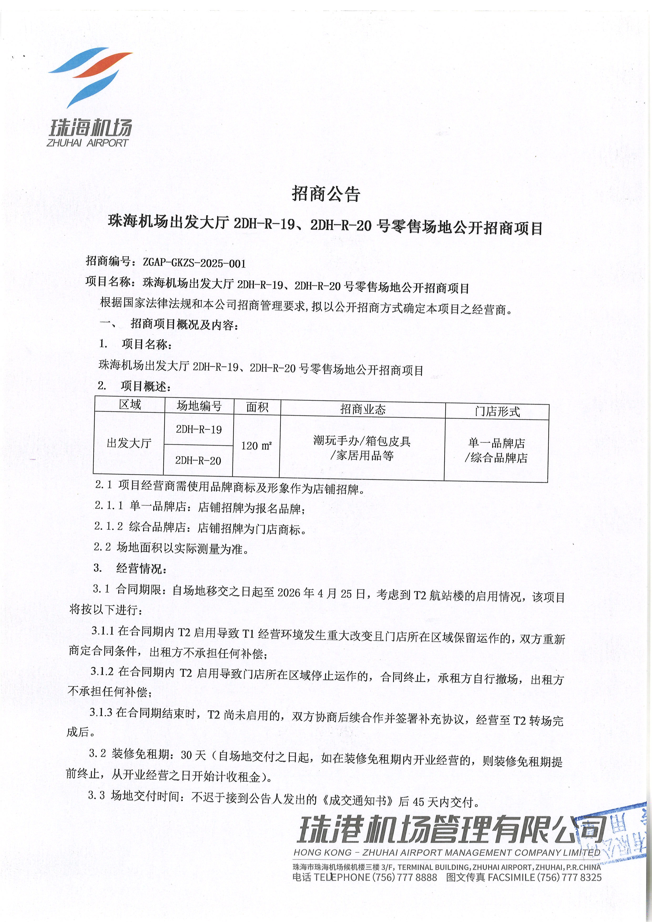 珠海機(jī)場(chǎng)出發(fā)大廳2DH-R-19、2DH-R-20號(hào)零售場(chǎng)地公開招商項(xiàng)目