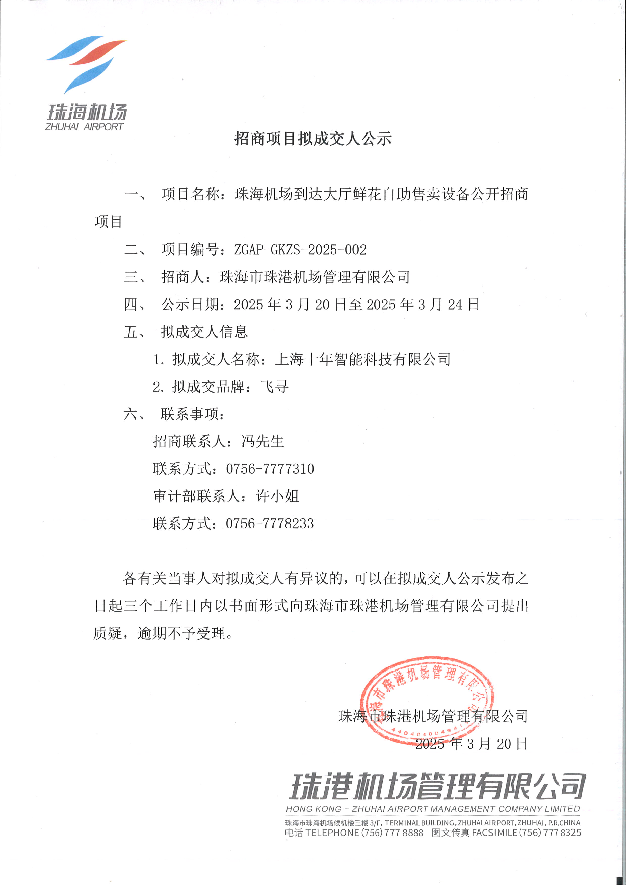 珠海機場到達大廳鮮花自助售賣設備公開招商項目擬成交人公示