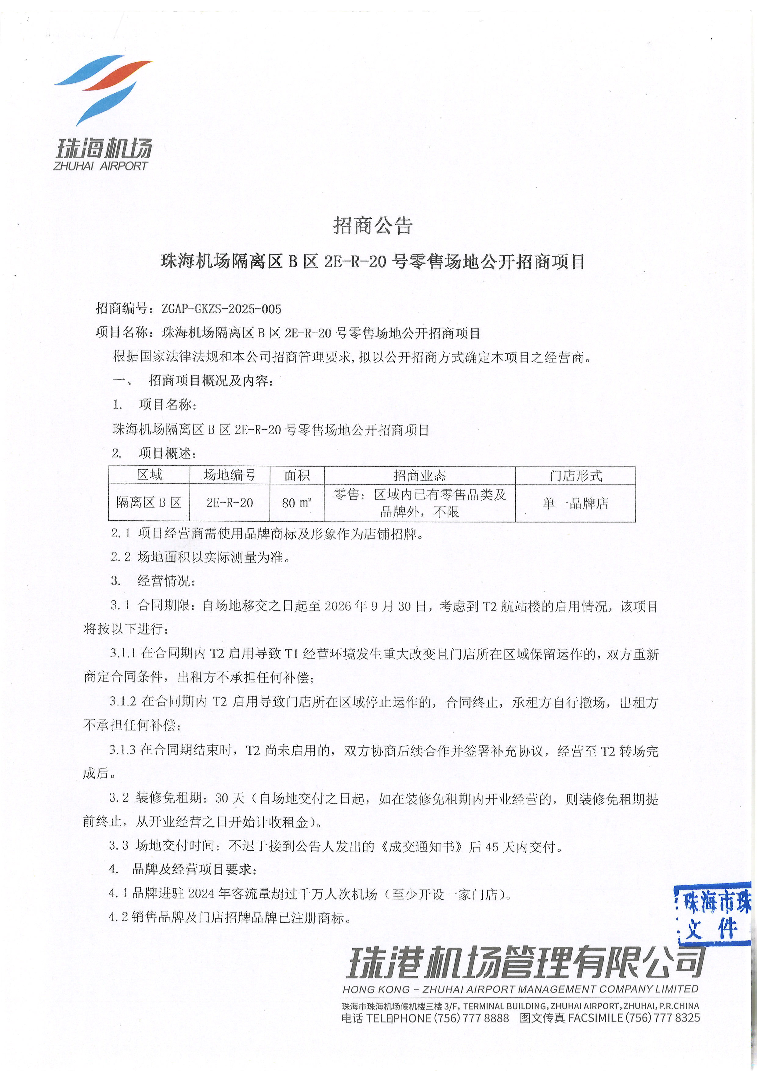 珠海機(jī)場隔離區(qū)B區(qū)2E-R-20號零售場地公開招商項目