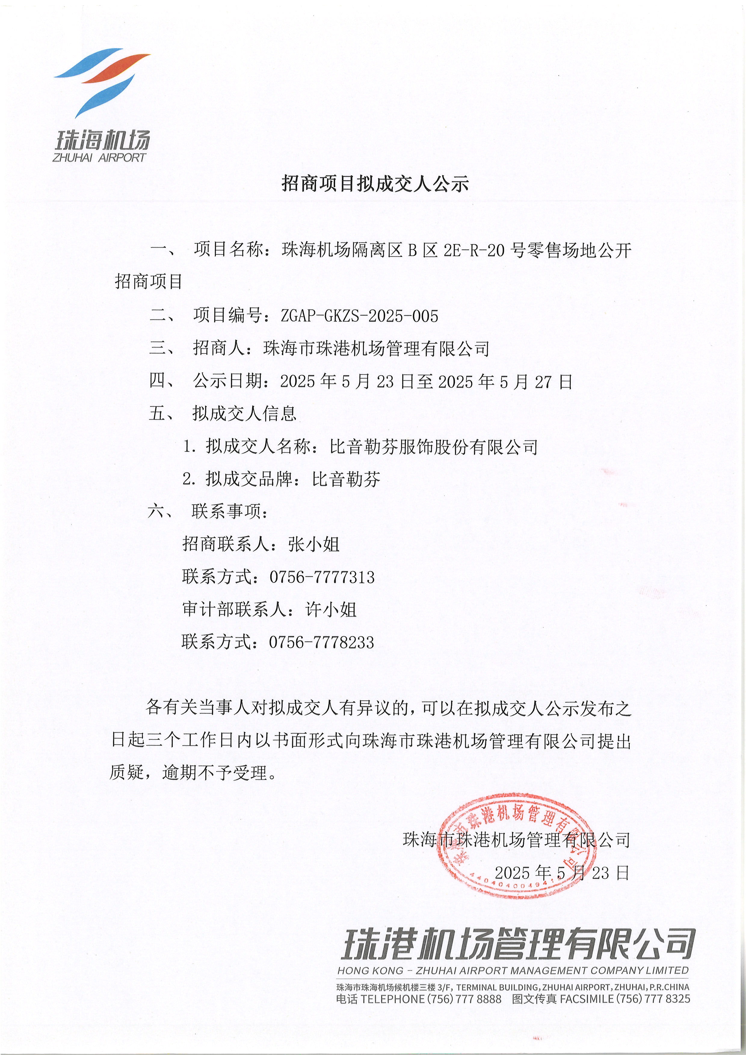 珠海機場隔離區B區2E-R-20號零售場地公開招商項目擬成交人公示
