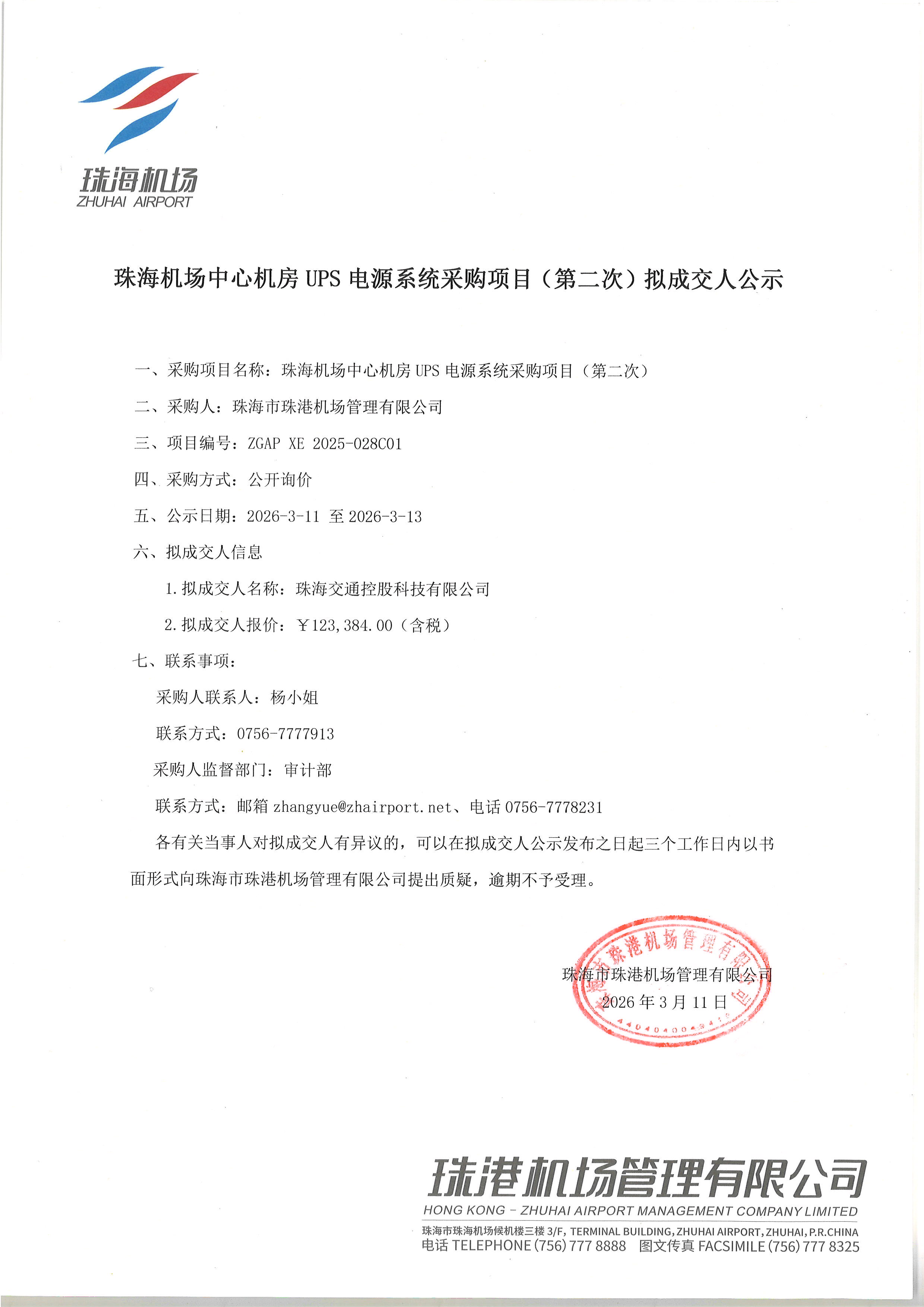 珠海機場中心機房UPS電源系統采購項目(第二次)擬成交人公示
