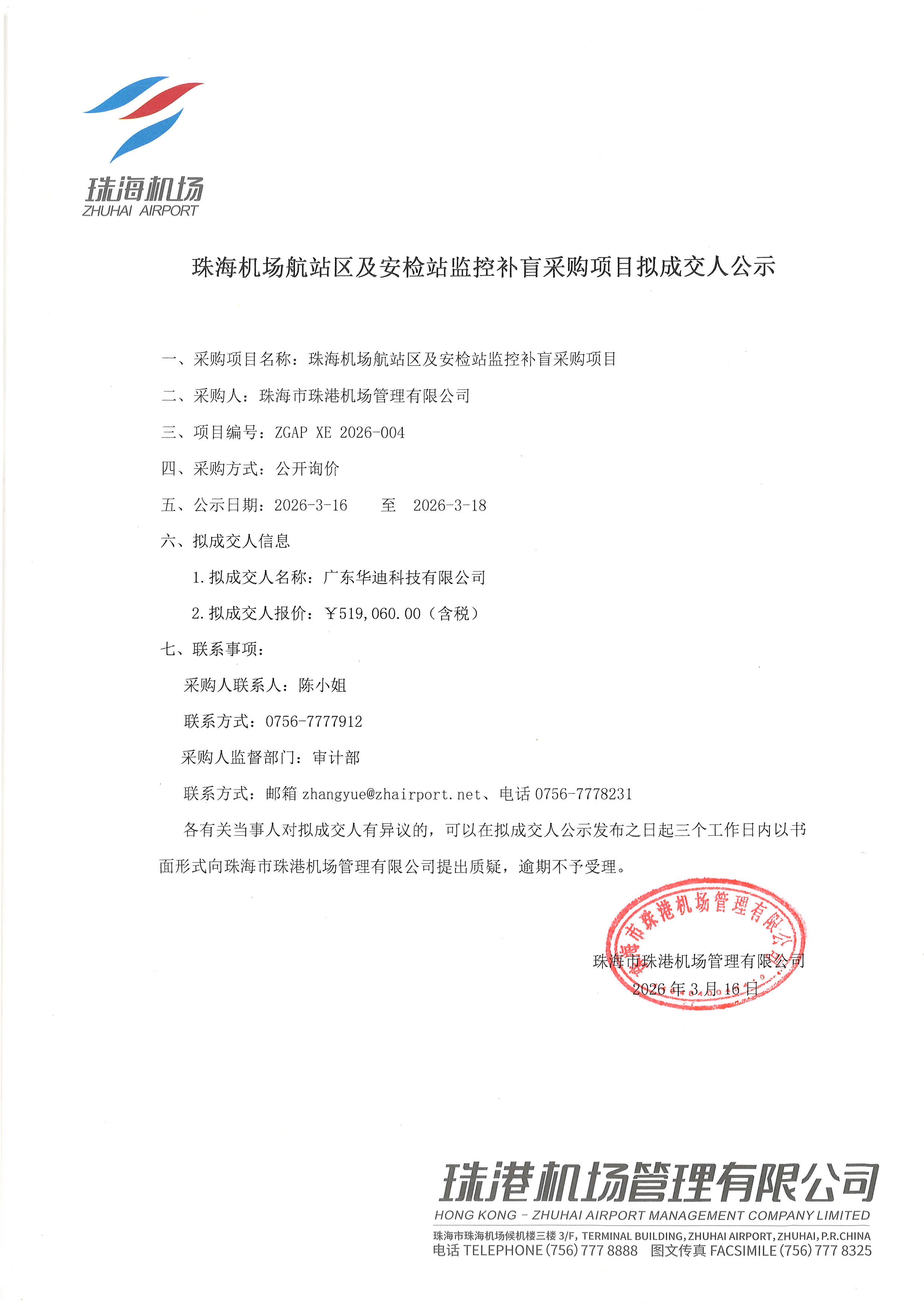 珠海機場航站區及安檢站監控補盲采購項目擬成交人公示