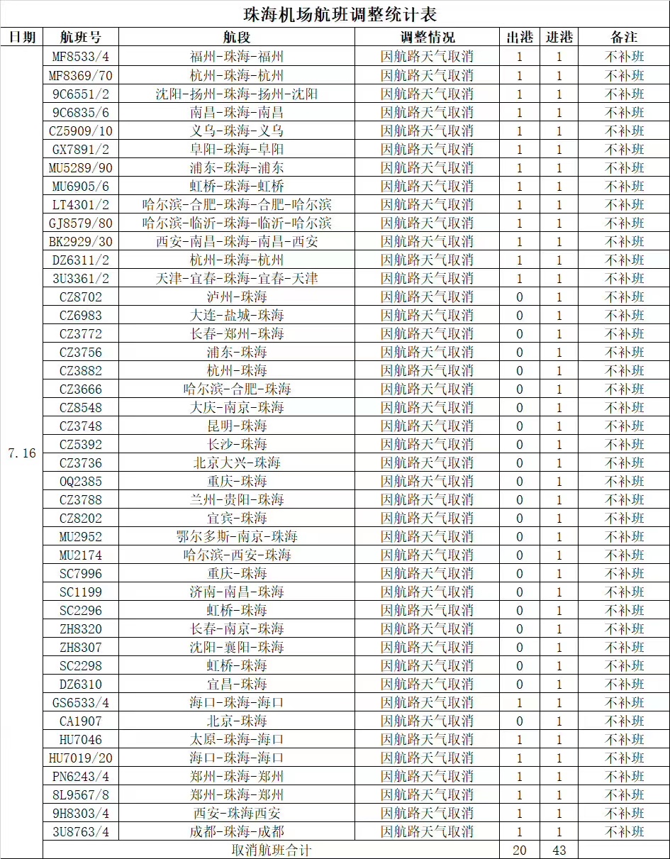 【航班取消信息】受航路天氣影響,珠海機場取消7月16日進港航班43班,出港航班20班(詳見下圖),請出行旅客及時留意航班信息,與所購票航空公司聯系,合理安排出行。