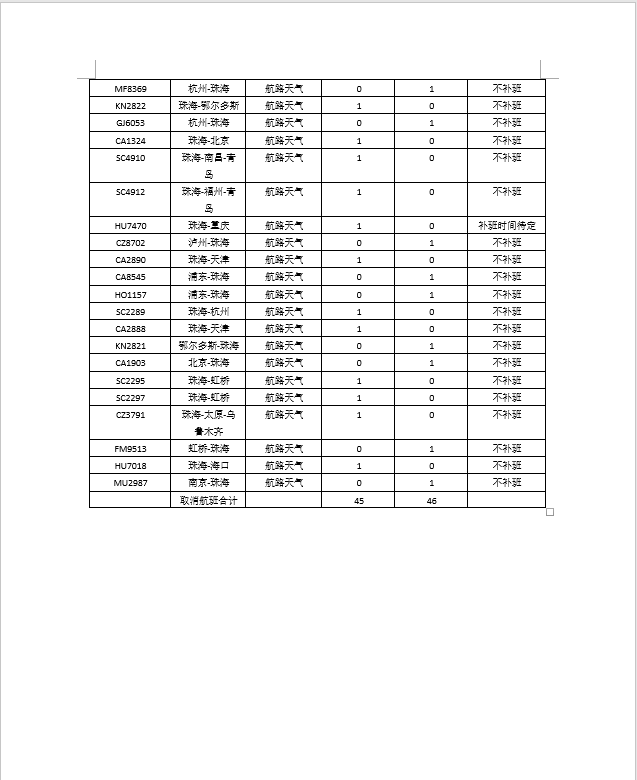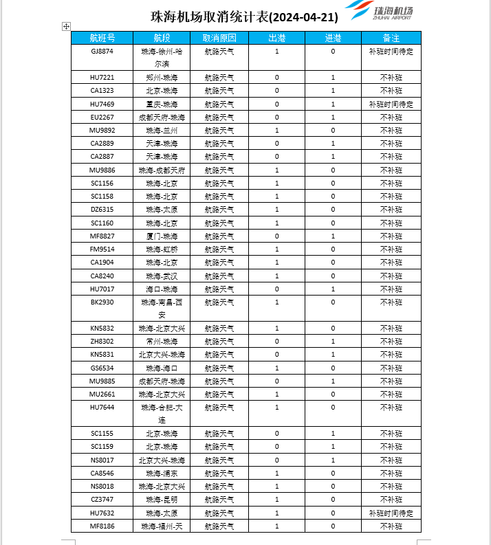 受天氣影響,珠海機場取消4月21日進港航班46班,出港航班45班,詳見下圖,請出行旅客及時留意航班信息,與所購票航空公司聯系,合理安排出行。(詳見下圖)