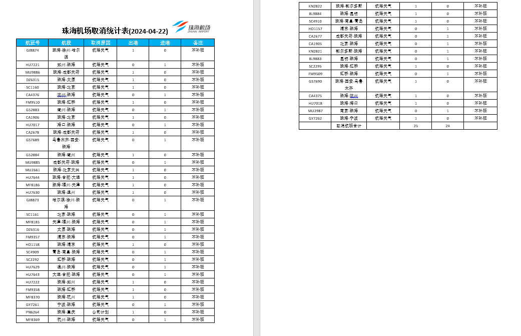 受天氣影響,珠海機(jī)場取消4月22日進(jìn)港航班24班,出港航班25班,詳見下圖,請出行旅客及時留意航班信息,與所購票航空公司聯(lián)系,合理安排出行。(詳見下圖)