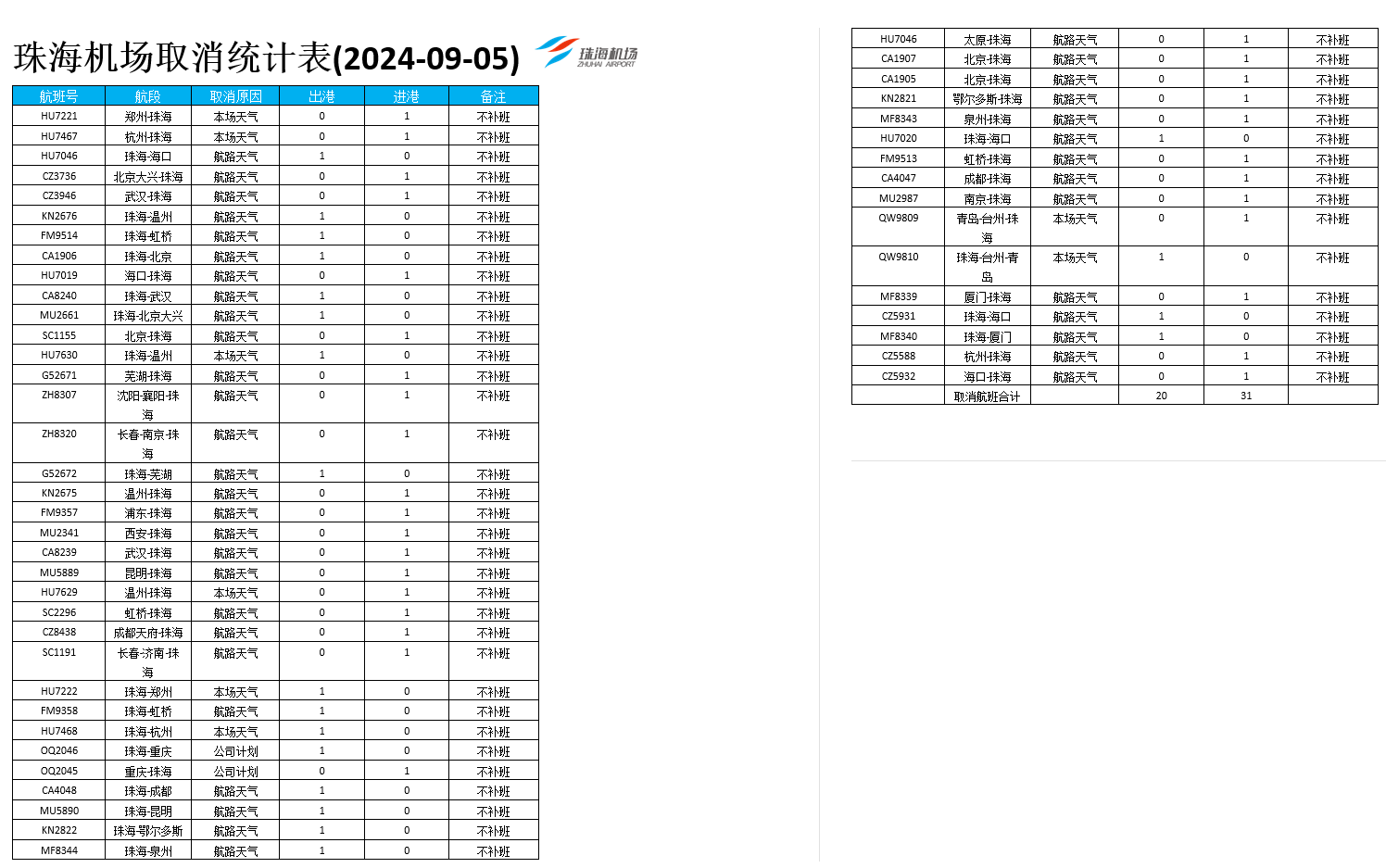 受天氣影響,珠海機(jī)場取消9月5日進(jìn)港航班31班,出港航班20班,詳見下圖,請出行旅客及時(shí)留意航班信息,與所購票航空公司聯(lián)系,合理安排出行。