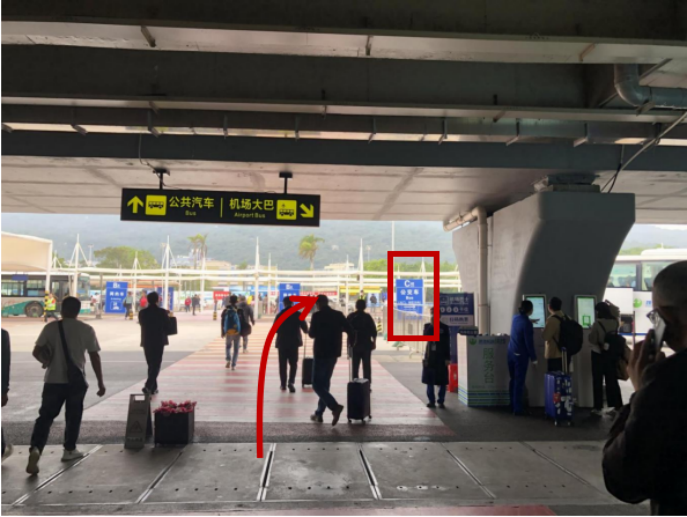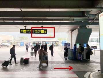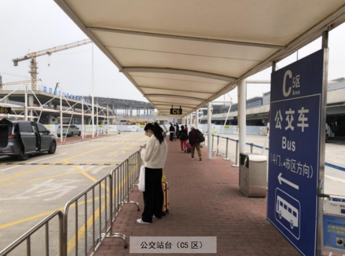 需乘坐公交車的旅客,可在一層到達大廳(03)出口前行50米右側,到達一層接客區(C5區)公交站臺處。