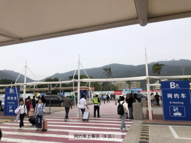 需要乘坐網約車的旅客,可在一層到達大廳(03)出口出來前行60米到達一層網約車通道的上客區域(B1-B5或者A1-A5)。