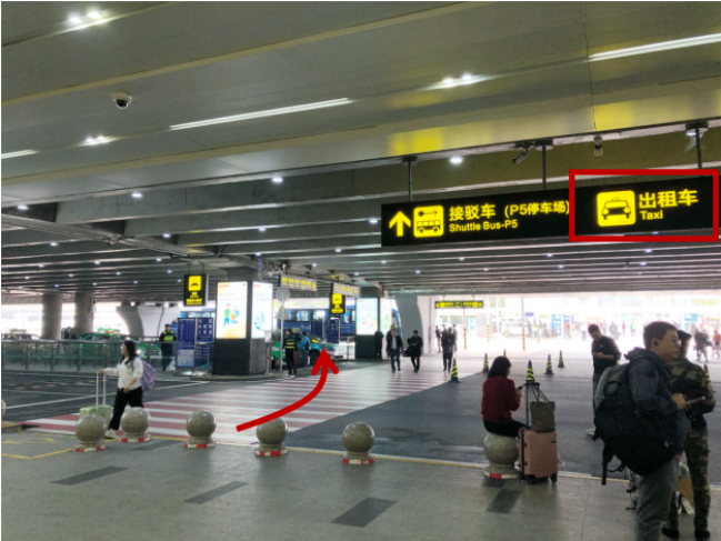 需要乘坐出租車前往市區方向(香洲、拱北、吉大、橫琴、唐家)的旅客,可在一樓到達大廳(03)出口出來前行20米左側,到達一層市區出租車排隊通道上客點。