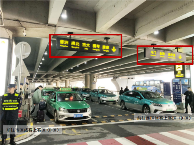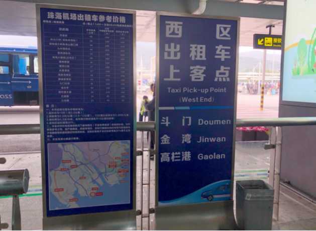 需要乘坐出租車前往西區方向(斗門、金灣、高欄港)的旅客,可在一樓到達大廳(03)出口出來前行25米左側,到達一層西區出租車排隊通道上客點。