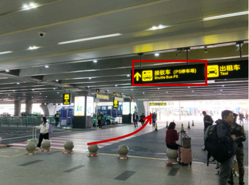 車輛停放在P5停車場的旅客,可在一層到達大廳(03)出口前行40米左側,乘坐P5停車場免費接駁車前往停車場。
