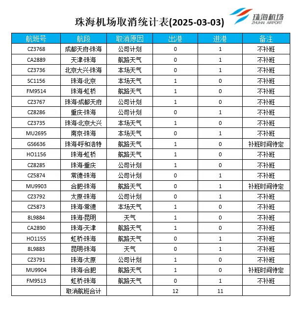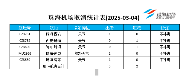 受天氣影響,珠海機場取消3月3日出港航班9班,進港航班8班,取消3月4日出港航班3班,進港航班2班,詳見下圖,請出行旅客及時留意航班信息,與所購票航空公司聯系,合理安排出行。
