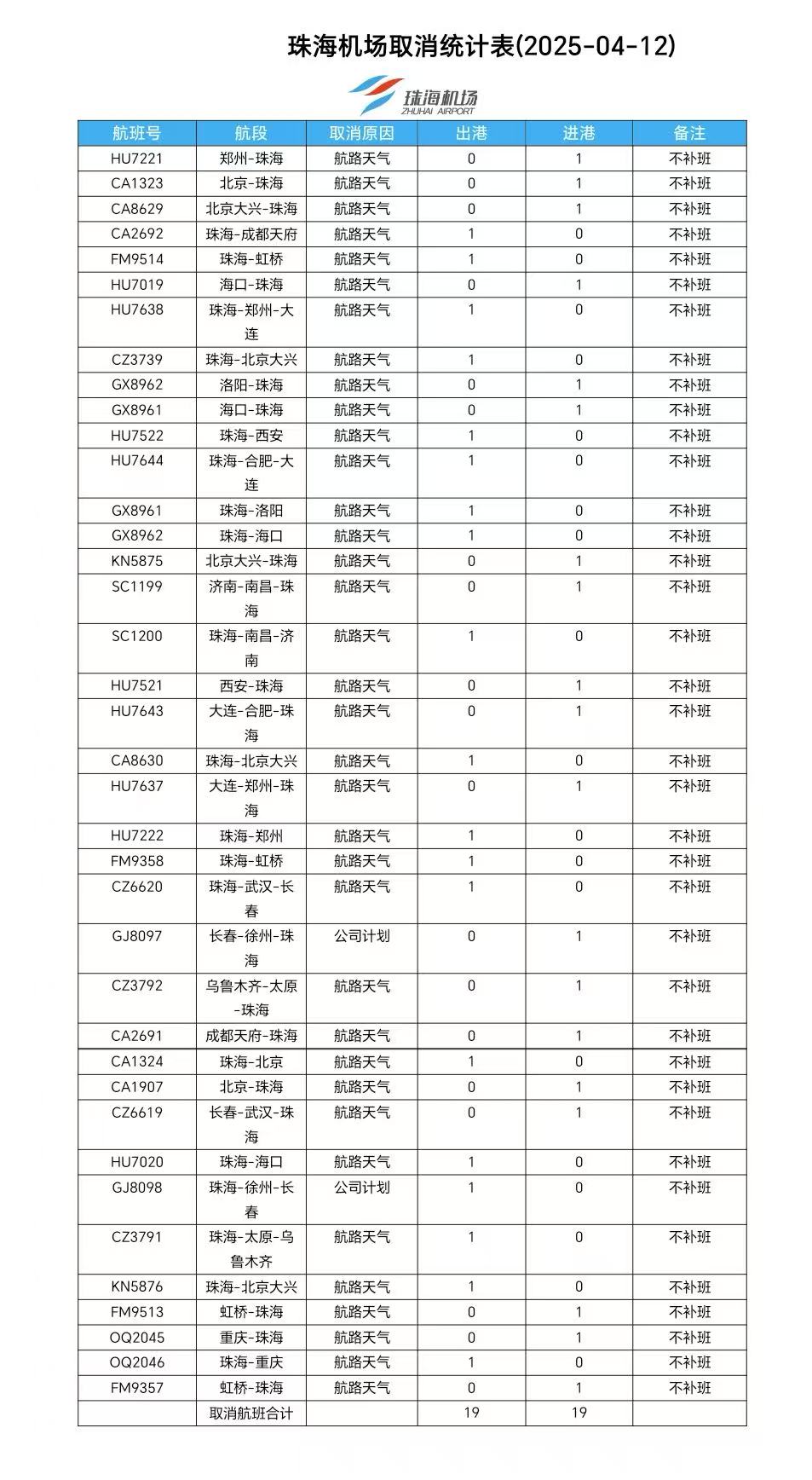 【航班取消信息】受天氣影響,4月12日,珠海機場取消出港航班19班,進港航班19班,詳見下圖,請出行旅客及時留意航班信息,與所購票航空公司聯系,合理安排出行。