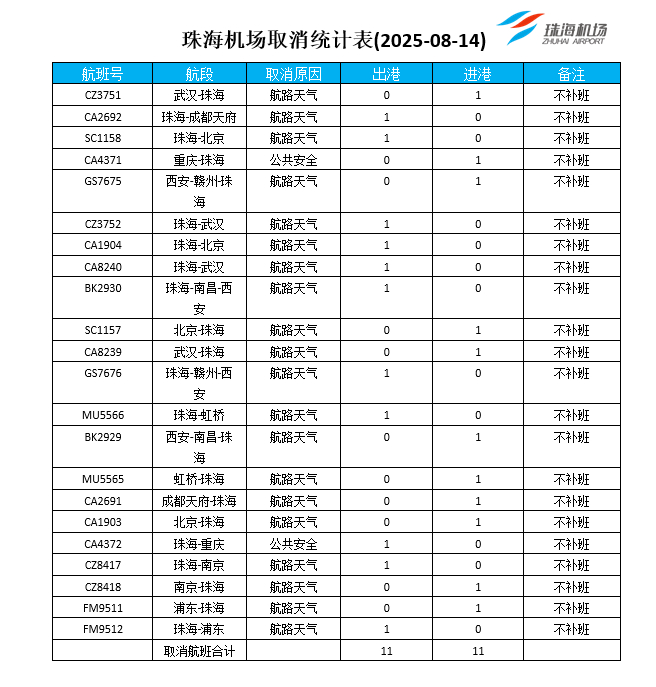 【航班取消信息】受航路天氣影響,8月14日,珠海機場取消出港航班11班,進港航班11班,詳見下圖,請出行旅客及時留意航班信息,與所購票航空公司聯(lián)系,合理安排出行。