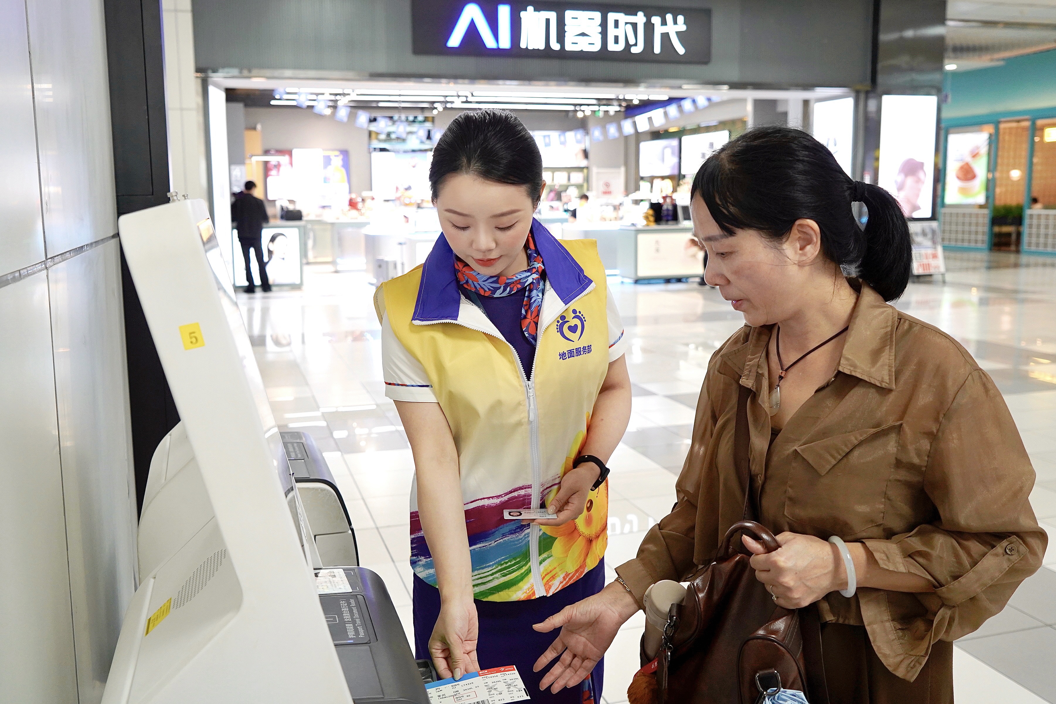 身著黃馬甲的“向日葵”服務班組成員在自助值機區、值機區及行李提取區,為特殊旅客提供問訊服務及免費輪椅服務,協助辦理乘機手續和安檢,隨后安排專人引導登機。